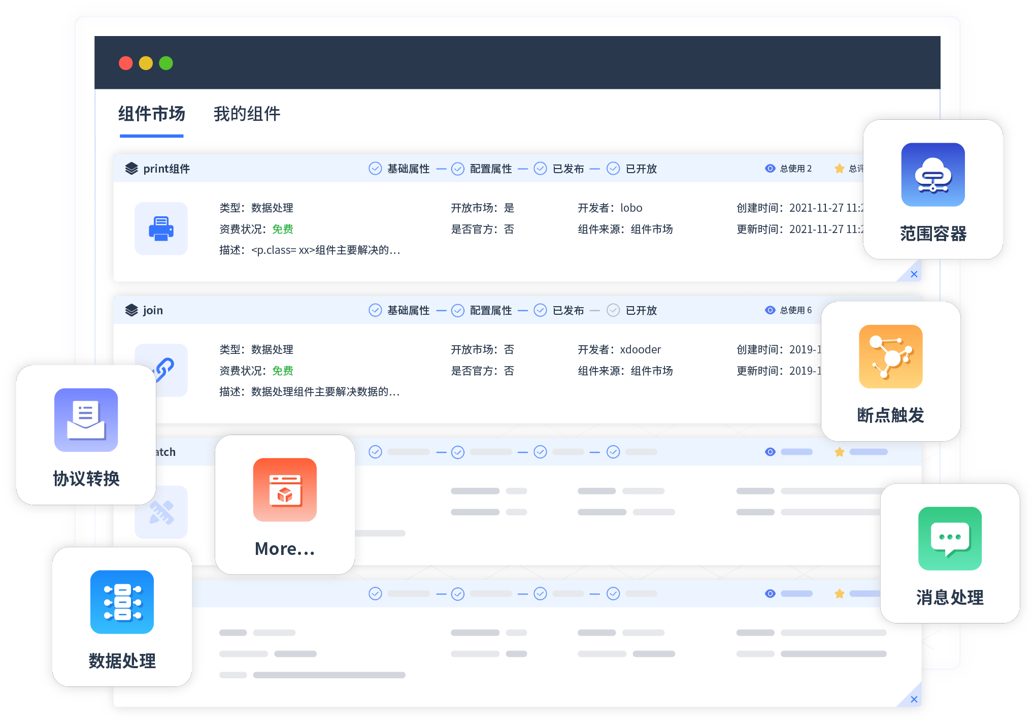 针对集成场景,,,美团钱包商家版提供组件市场,,,例如协议转换、、、、消息处理、、、文件操作等。。除平台提供的组件外,,客户可以自定义所需组件。。。
