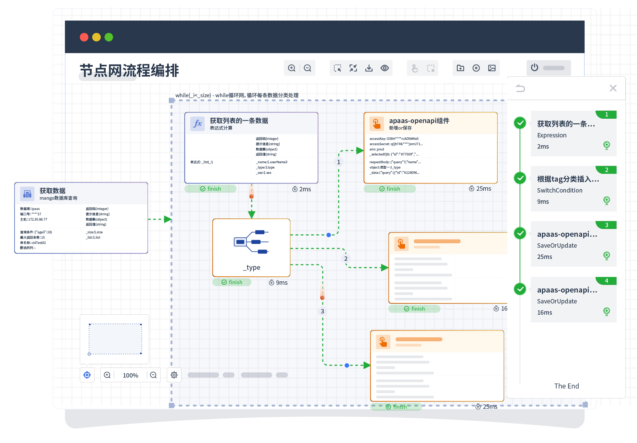 针对集成场景,,组件定义后支持进行流程编制,,不同于传统代码方式,,,通过图形化展示,,支持在线调试、、日志查看和运行回放。。